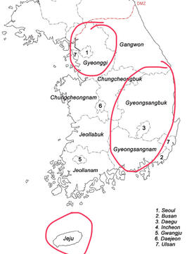 While a lot of South Korean dialects have strong influences from Middle Korean, Jeju Dialect is known to have the most influence and the closest relationship to middle korean out of all of them to it. Furthermore, I believe that geography has played a huge role in the differences between the dialects. As can be seen on the map, Jeju Island is a little ways off the mainland; approximately 60 miles. I have no doubt that this has influenced the dialect due to its forced isolation, leading to less similarities and assimilations between the dialects.
